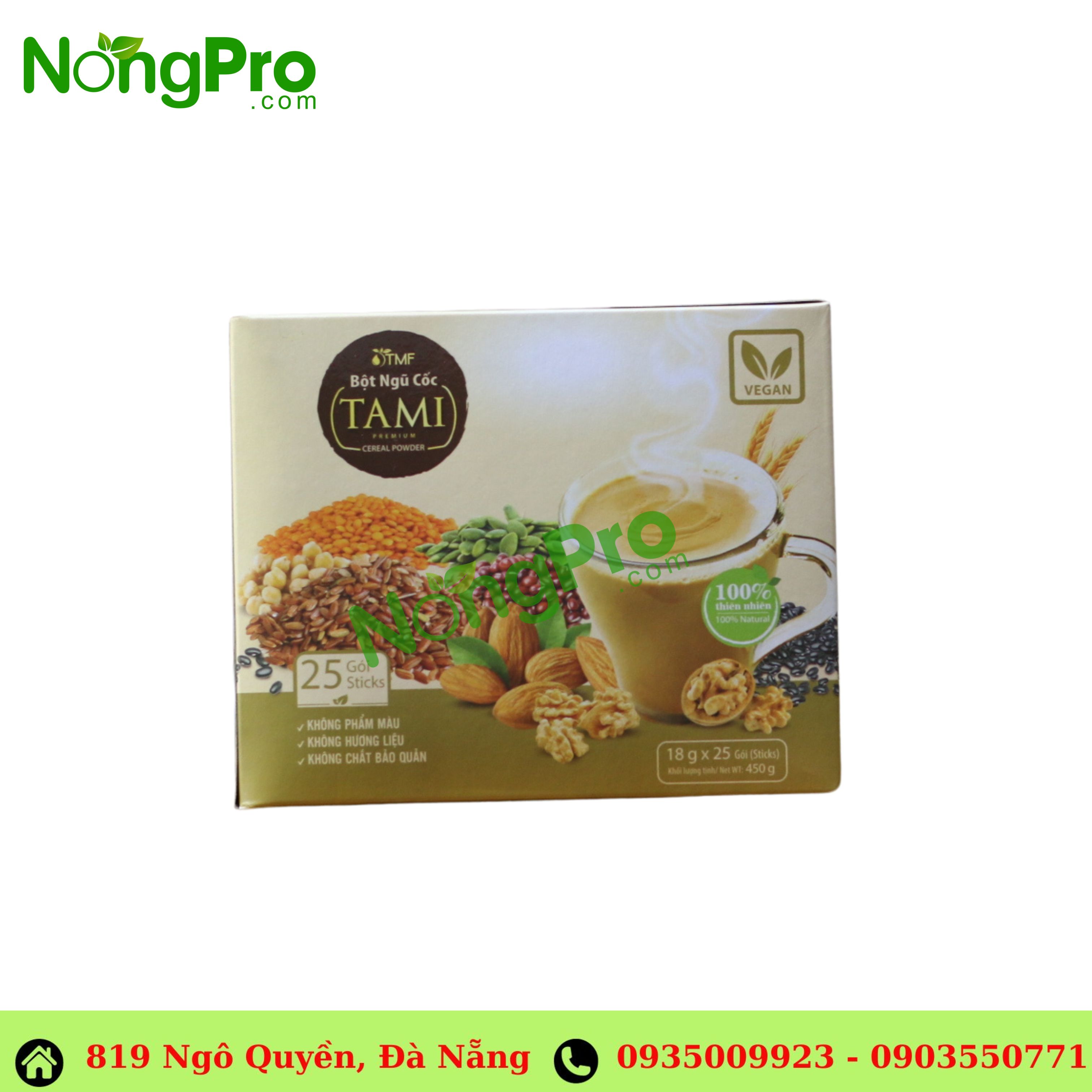 - Bột ngũ cốc TAMI 450 g (18 g x 25 gói) được sản xuất từ 100% tự nhiên, không sử dụng hóa chất, phẩm màu, hương liệu, chất bảo quản.